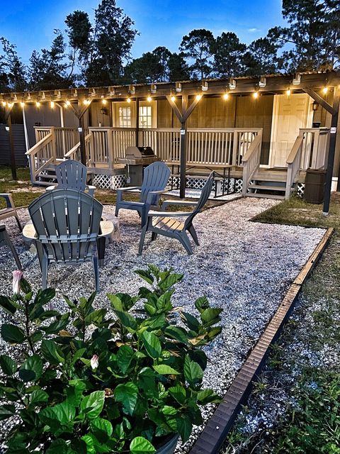 Ambiance at night! String lights on covered deck. Grill, dine on a picnic table or roast s'mores sitting in an Adirondack chair around the Fire Pit!