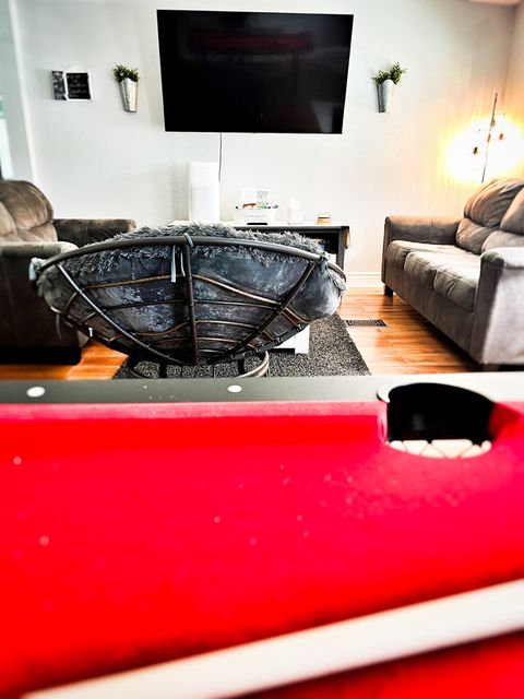 Living area with papasan chair. View from pool table